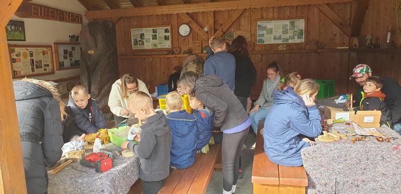 Nach der Rückkehr ins "Eulennest" wurde dann gemeinsam gebastelt: Mit großem Eifer bauten die Kinder zusammen mit ihren Eltern aus vielen vorbereiteten Einzelteilen phantasievolle Waldwichtel in