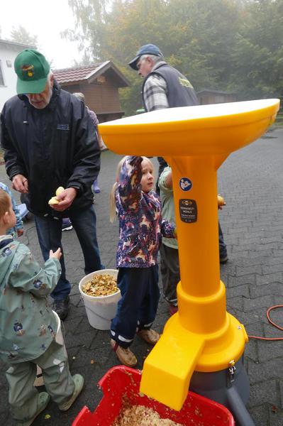 Schneller und effizienter aber ging das Ganze dann mit dem erstmals eingesetzten neuen Equipment der AG: Mittels einer strombetriebenen Kernobstschneidemühle und einer mit Wasserdruck betriebenen