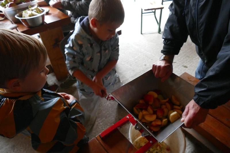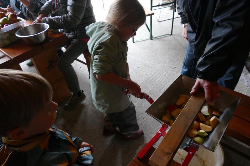 die Äpfel in einer handbetriebenen Obstmühle weiter zerkleinert und anschließend in einer Presse durch Druck ebenfalls von Hand zu Saft vearbeitet, ein ziemlich umständlicher und mühevoller, aber für