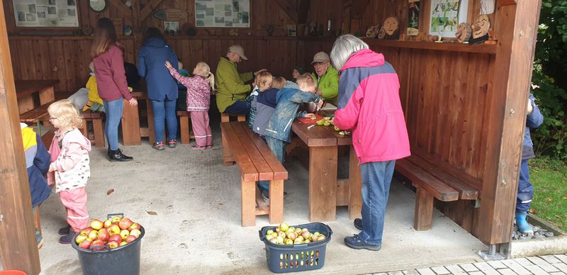 Vor einigen Tagen waren die Kinder der hiesigen Kita „Schatzfinder“, die im kommenden Jahr zur Schule gehen werden (die „Schukis“), wieder zum jährlichen gemeinsamen Apfelsaftpressen bei der AG „Naturschutz“ eingeladen.
