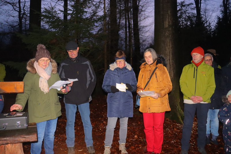 Petroleumlampen und in Gläsern geschützten Kerzen beleuchteten Wald wurden Gedichte und Geschichten vorgetragen, bevor an der Schutzhütte nach Muscheid hin der Posauenenchor Oberdreis weihnachtliche