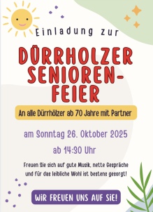 Die diesjährige traditionelle Seniorenfeier der Ortsgemeinde Dürrholz findet am Sonntag, den 26. Oktober 2025 um 14:30 Uhr im Gemeinschaftshaus in Daufenbach statt.